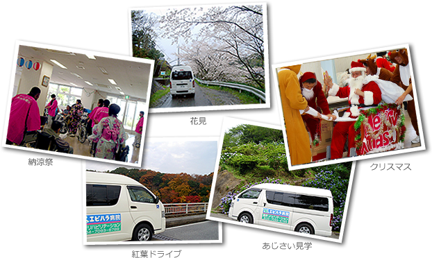 一年を通し、花見、あじさい見学、紅葉ドライブや、各月毎、行事を考え、利用者の方に楽しんでいただける様、心がけています。
