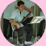 司会もケア課T社員が行い、お誕生日会が進行して行きました。5月のお誕生月の方を祝福し、その後に催しものとなりました。まずは新入社員歓迎会で話題となった、沖縄の三線!