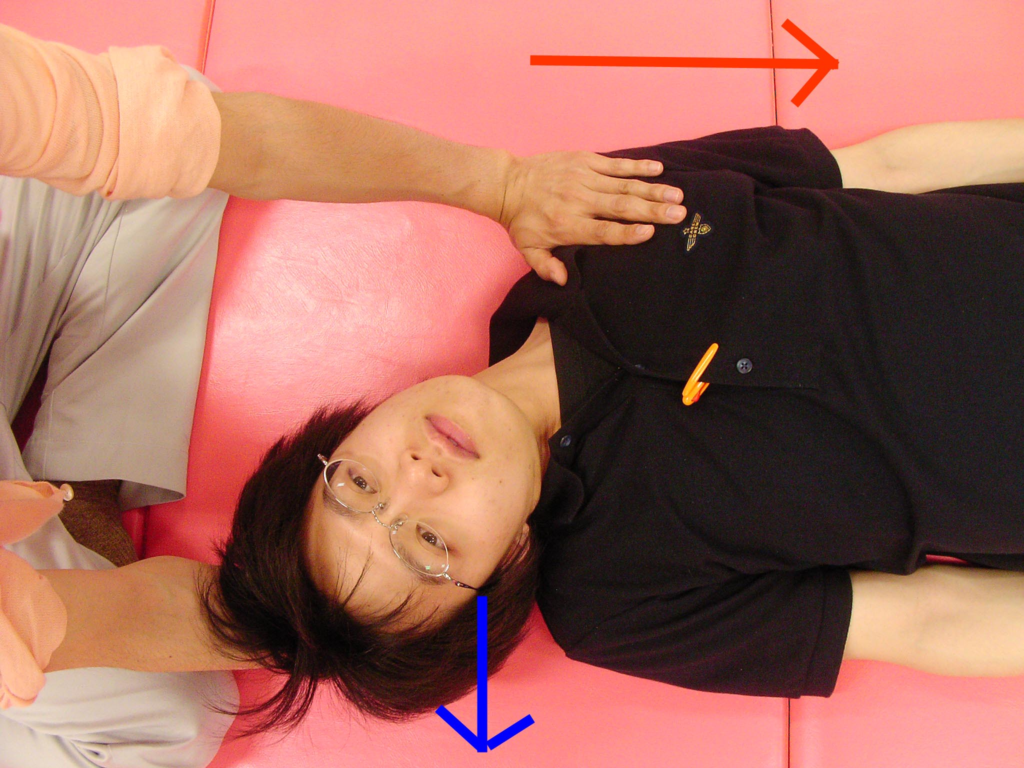 左側屈の場合(左上の写真)は、左手は後頭部を優しく把持し支える。次に右手は肩(肩峰)を軽く押さえます(赤矢印)。右上肢は肩(肩峰)を腕の方へ押し下げながら、左手で頸部を左へ倒していきます(青矢印)。