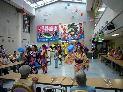 を入居者の皆様と踊りました。ケア課社員数名が、浴衣姿で一緒に踊りました。