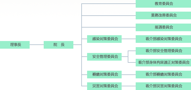 | 接遇委員会 | ・患者・家族の満足度を高め、患者・家族の立場を尊重した看護・介護体制を作ることを目的とする | 接遇の実態調査と対策 ①患者・家族の満足度調査(投書箱など) ②調査内容の分析と対策 ③投書や苦情に対しての対応・処理 ④院内巡視(院内設備の不備の改善) ⑤接遇教育(研修会の企画・運営など) |